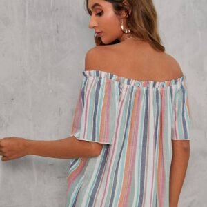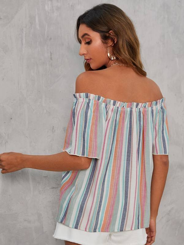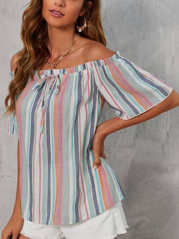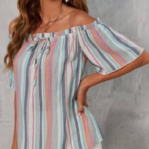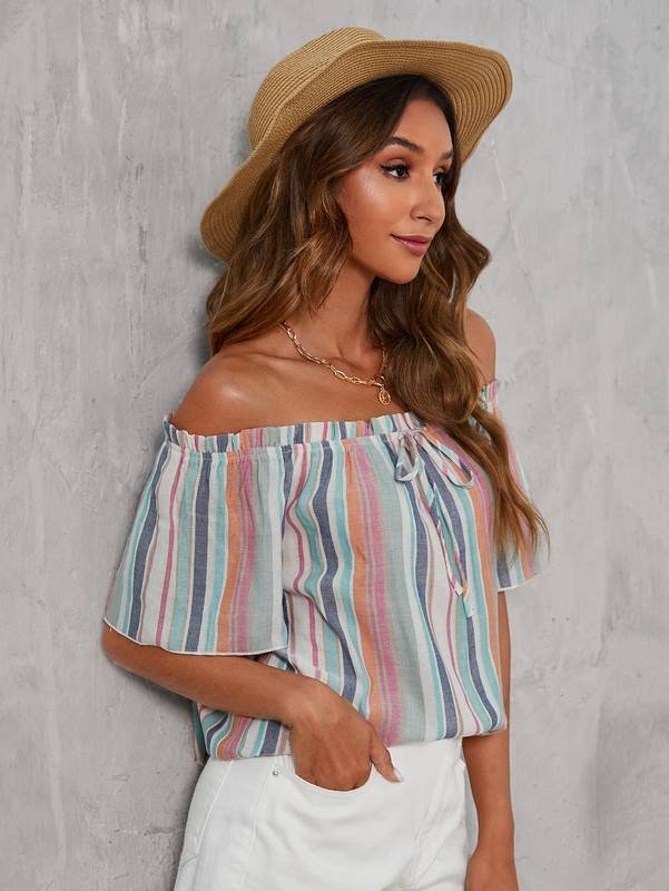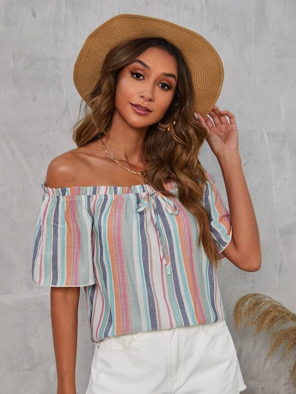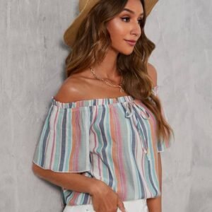 Be the first to review “Block Striped Off Shoulder Frill Trim Knot Front Blouse” Cancel reply
