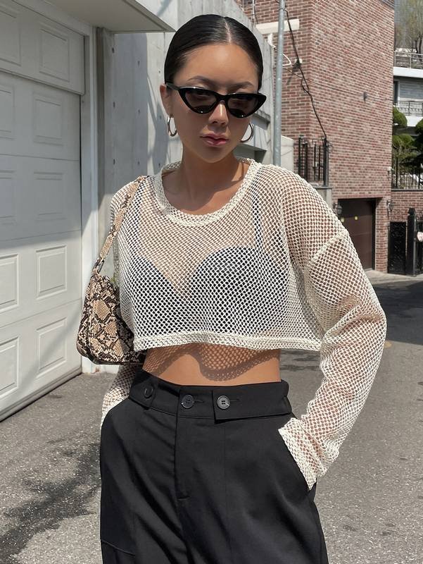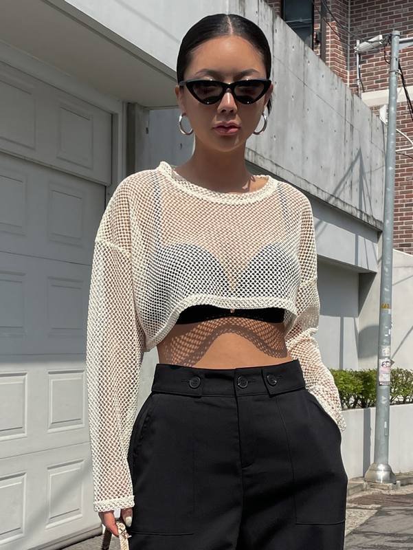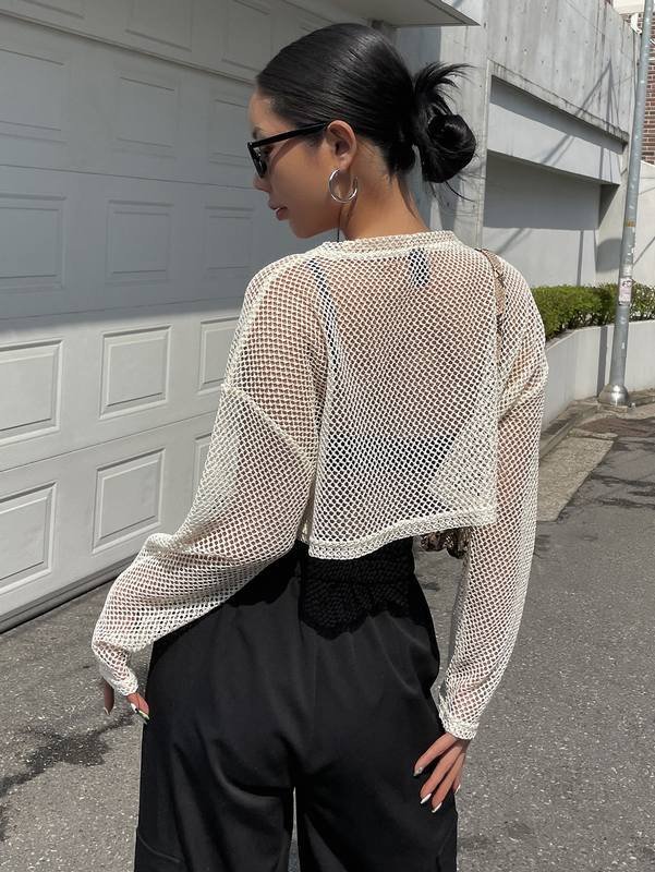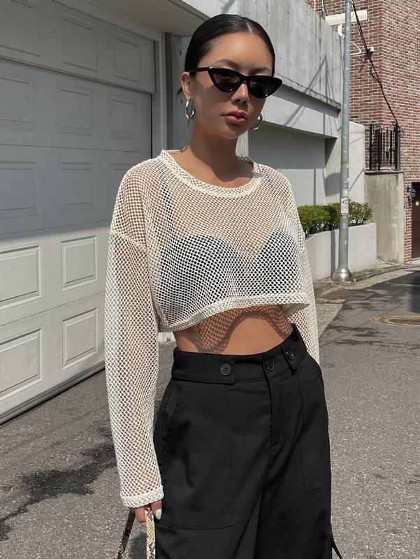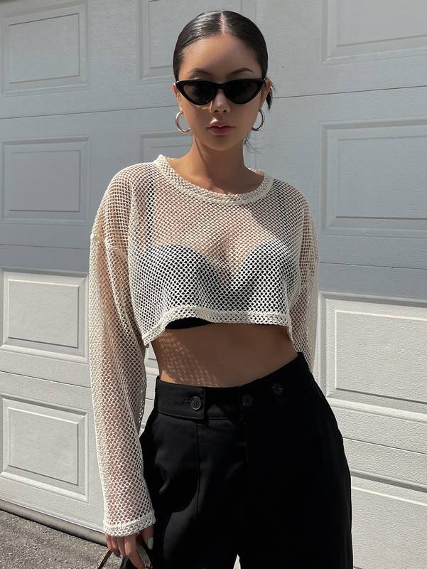 DAZY Open Knit Drop Shoulder Crop Sheer Top Without Bra
