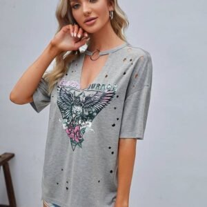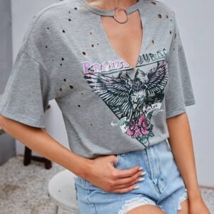 Be the first to review “Eagle & Floral Print O-ring Choker Neck Drop Shoulder Tee” Cancel reply