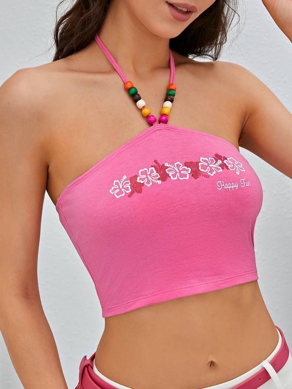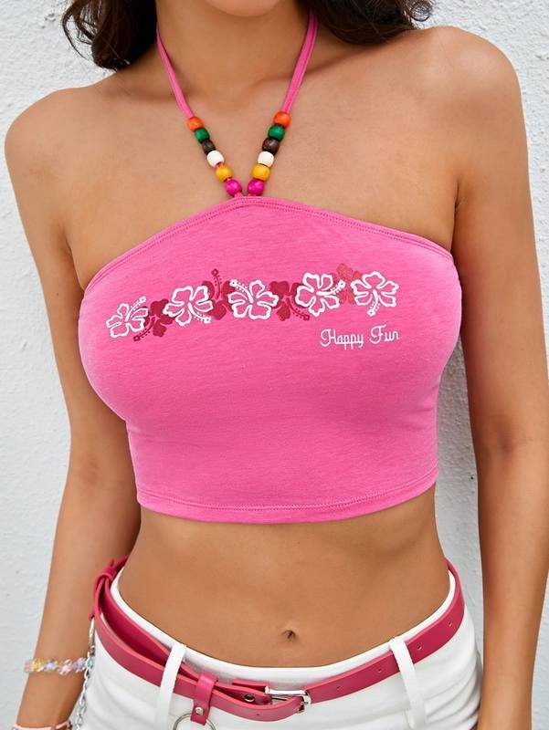 Floral & Slogan Graphic Wooden Beaded Detail Halter Top