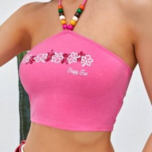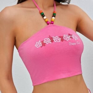 Be the first to review “Floral & Slogan Graphic Wooden Beaded Detail Halter Top” Cancel reply