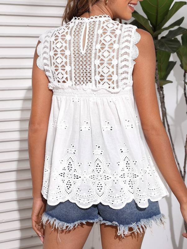 Guipure Lace Panel Frill Trim Shirred Schiffy Blouse