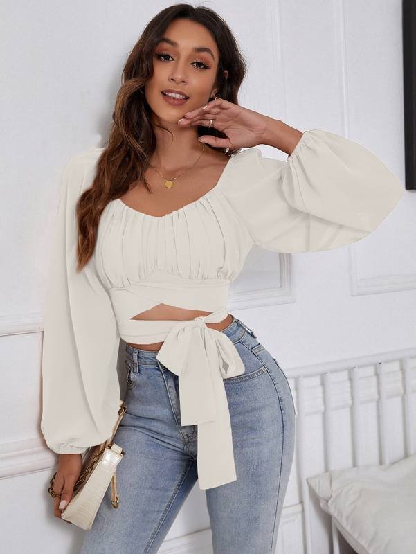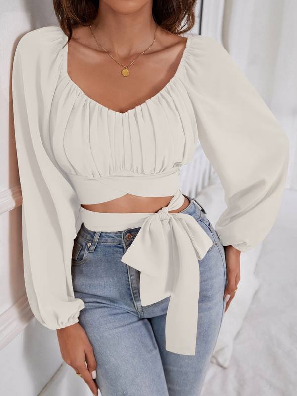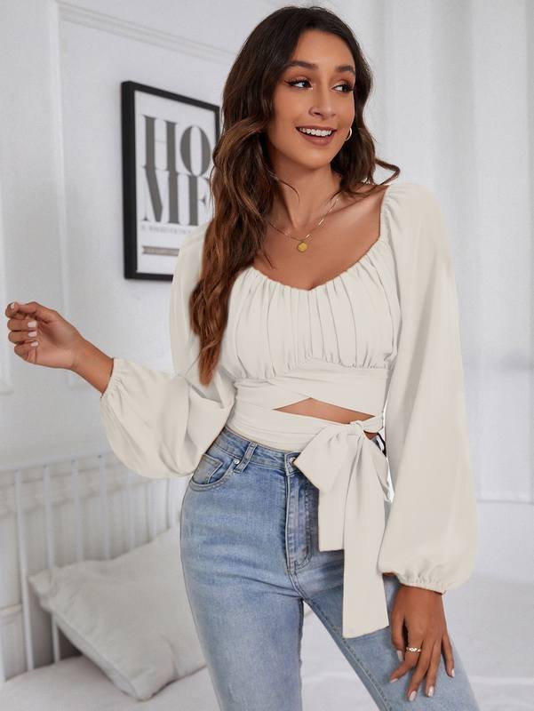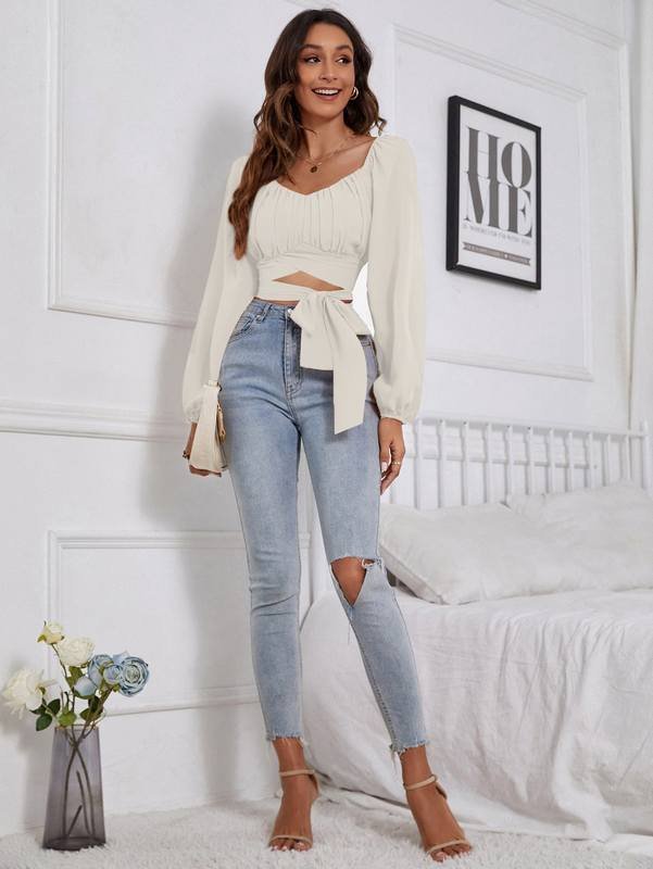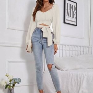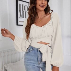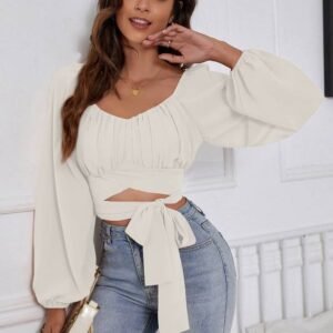 Be the first to review “Ruched Bust Lantern Sleeve Knot Front Crop Blouse” Cancel reply